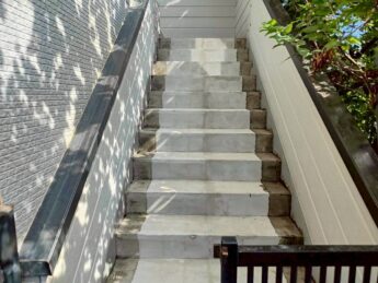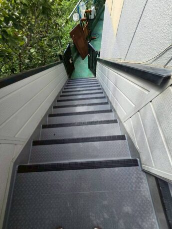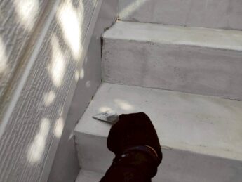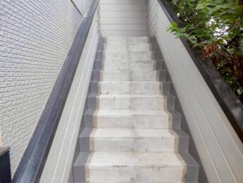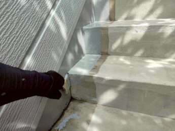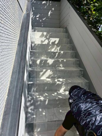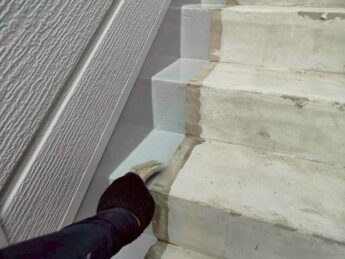 この度は工事のご依頼をいただきありがとうございます。以前に屋上防水工事をさせていただいたお客様から雨漏りについてご相談をいただきました。自宅玄関への階段下の物入れに雨漏りがあり倉庫内の資材が濡れてしまうとのことでした。現地を確認させていただいたところ現状がタイル張りで目地部分のモルタルが痩せていたり隙間があったりと浸水しそうな箇所がいくつも見受けられました。ご提案としまして、現状のタイルの上に長尺シートを敷く施工方法をおすすめさせていただきました。既存タイルの目地詰めを行い不陸調整を行った上で巾木に防水、長尺シートを貼らせていただきました。