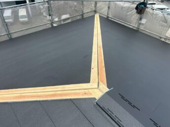 棟板金を固定するための下地となる貫板を設置します。この貫板を覆うように新しい板金を被せ、側面からビス留めして完成となります。