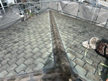 カバー工法は既存の屋根の上に新しい防水シートと屋根材を重ねるため、棟板金を撤去し表面をできるだけフラットにします。