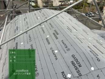 屋根材を葺く前にルーフィングシートを貼っていきます。