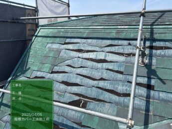 この度は工事のご依頼をいただきありがとうございます。弊社のロードサインを見てお問い合わせいただきました。数年前の台風の影響で屋根材が破損してしまいその破損個所から雨漏りがあり塗装ではなくカバー工法をご検討されました。現地を確認させていただいたところ、屋根全体に築年数相応の色あせや退色が見られ、広範囲に屋根材の剥がれなどの破損個所が見受けられました。屋根材が剥がれてしまっている箇所につきましては屋根材の下に敷いているルーフィングシートも穴が開いていたり下地が腐食していたりとかなりの劣化が見られました。ご提案としまして、コンパネ下地とルーフィングシートを張り替えた上でスーパーガルテクトを使いカバー工法をおすすめさせていただきました。