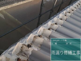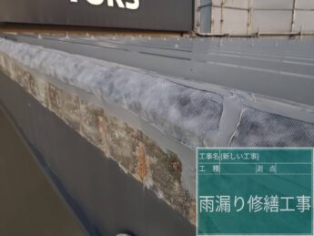 この度は工事のご依頼をいただきありがとうございます。三菱自動車の店舗内に雨漏りがしているとのことでご相談をいただきました。普通の雨の時は雨漏りはないですが吹き降りの強い時に限り雨漏りがあるとのことでした。散水調査をさせていただいたところ、屋根の笠木部分からの雨水の浸水を確認することができました。海が近いこともあり浜風の影響で雨が吹き込んでいたことが原因と考えられます。ご提案としまして笠木の板金の交換、面戸のシール処理、防水テープ処理などをおすすめさせていただきました。